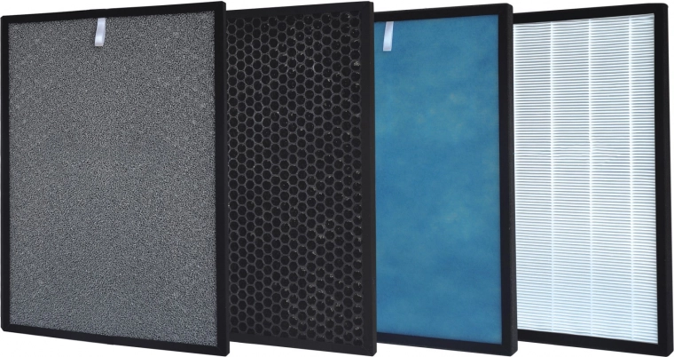 Deze complete filterset combineert een voorfilter, actieve kool, een katalytische en antibacteriële laag met het zeer efficiënte HEPA H13-filter. Samen vormen ze een geavanceerde, tot 6-traps filtratie die effectief vaste deeltjes PM2.5, schimmelsporen, bacteriën, de meeste virussen en onaangename geuren in huis elimineert.