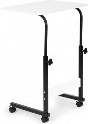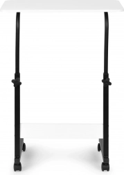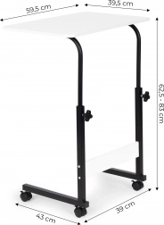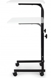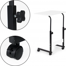 De verticale poten van het tafeltje hebben twee schroeven waarmee het blad kan worden vastgezet op de gewenste hoogte. De hele constructie is uitgerust met vier wielen voor eenvoudig verplaatsen. Voor extra stabiliteit bevatten de wielen een vergrendeling, die eenvoudig te bedienen is.