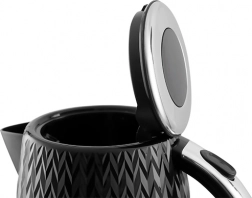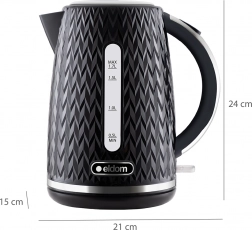 De ELDOM C260 Nelo combineert een elegante zwarte look met praktische functies voor dagelijks comfort. Dankzij het vermogen van 2000 W brengt hij water zeer snel aan de kook, terwijl de waterpeilindicator eenvoudig bijvullen mogelijk maakt vanaf 0,5 l. De bediening is intuïtief – u opent het deksel met de knop bij het handvat en de LED-verlichte schakelaar geeft de werking duidelijk aan.