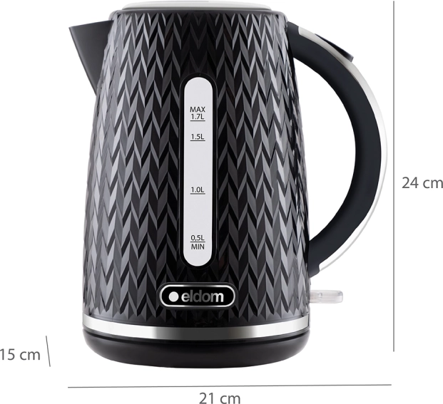 De stijlvolle waterkoker ELDOM C260 Nelo met een inhoud van 1,7 l en een vermogen van 2000 W kookt betrouwbaar water voor het hele gezin. Hij biedt een draadloos ontwerp met 360° draaibare basis, een duidelijke waterpeilindicator, automatische uitschakeling en een driedubbel veiligheidssysteem. Kwalitatieve OTTER-componenten, een handig knopje voor het openen van het deksel en een modern getextureerd design passen perfect in elke keuken.