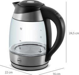 De waterkoker heeft een inhoud van 1,8 l, een minimum kookhoeveelheid vanaf 0,5 l en een afgedekte verwarmingsbodem voor eenvoudig reinigen. De glazen kan met LED-verlichting, het draaibare 360°-onderstel, het uitneembare filter en de waterpeilindicator verhogen het dagelijkse gebruiksgemak. Driedubbele beveiliging tegen oververhitting, overspanning en droogkoken zorgt voor veilig gebruik.