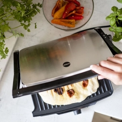 De ELDOM GK150 Flaat is een stijlvolle, compacte grill die een contactgrill voor panini, steaks en groenten combineert met de mogelijkheid van een vlakgrill bij openen tot 180°. Antiaanbakplaten maken bereiden zonder aanbranden en snel schoonmaken eenvoudig, terwijl de thermostaat met temperatuurregeling voor sappige en perfect gegaarde resultaten zorgt.