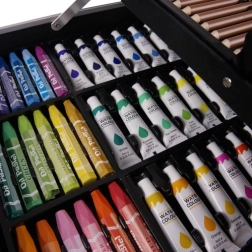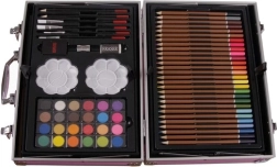 De inhoud is samengesteld om verschillende technieken te dekken – van subtiele schetsen en krachtige lijnen met stiften tot dekkend schilderen met acryl of lichte aquarelverlopen. Dankzij de stevige koffer met metalen verstevigingen en sluitingen is vervoeren veilig en comfortabel, thuis, op school of onderweg.