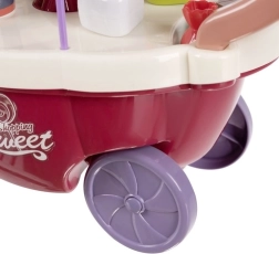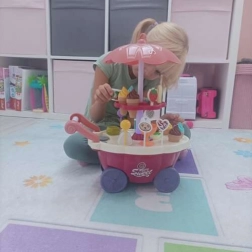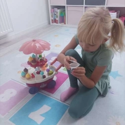 Geef kinderen hun eigen ijssalon! De kleurrijke ijskar met lichtjes en melodie biedt volop mogelijkheden voor rollenspellen. De set bevat schepijs en ijslolly’s, lollies, een beker, lepeltje en “muntjes” om betalen te oefenen. De roterende etagère (360°) presenteert de zoete lekkernijen prachtig.
