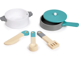 Inclusief “wasmachine” voor huishouddoekje-rollenspel en vijf houten accessoires: mok, pan met deksel, lepel, spatel en mes. Alles van veilig gelakt hout.