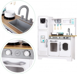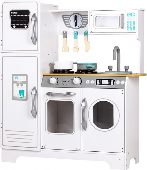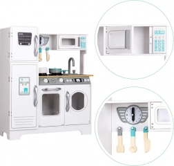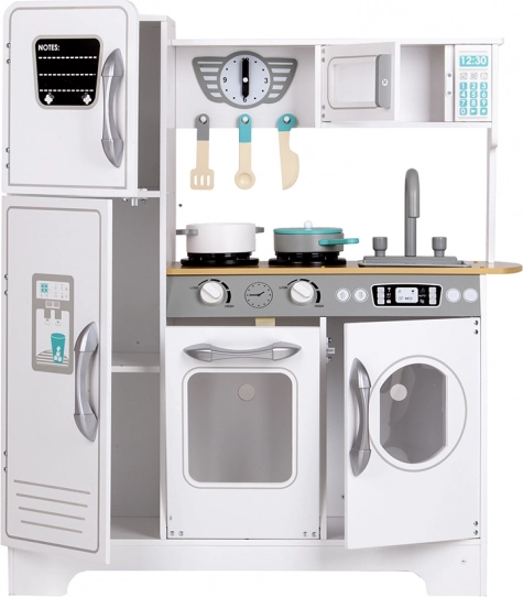 Ontdek de robuuste witte ECOTOYS-keuken, die elke kinderkamer in een klein culinair studiootje verandert. Dankzij realistische elementen – van draaiknoppen met geluid tot openende deurtjes en functionele opbergruimtes – beleven kinderen een authentiek spel met koken, bakken en afwassen.