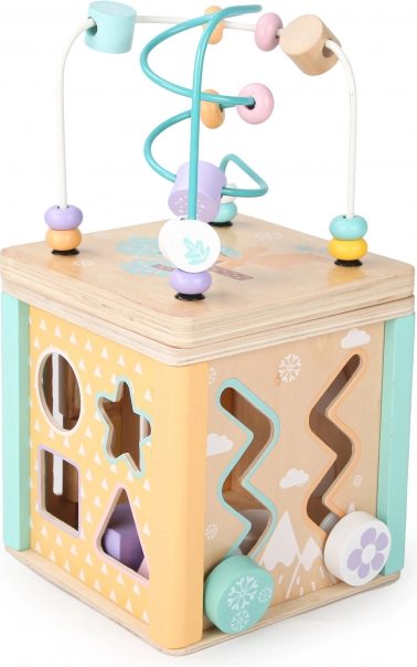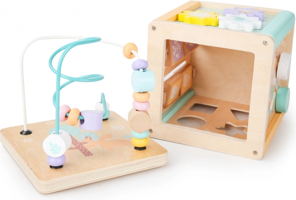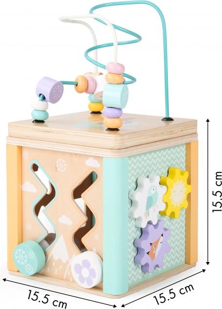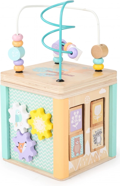 Elke zijde van de kubus biedt verschillende spelelementen, zoals een doolhof, schuifpuzzels of draaibare tandwielen, die de motorische en cognitieve vaardigheden van het kind ondersteunen.