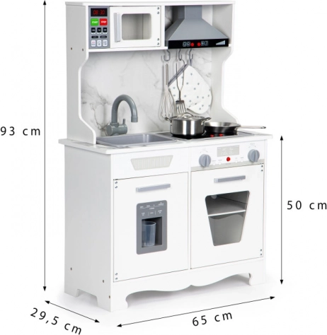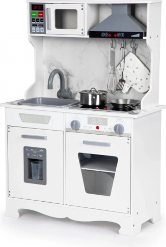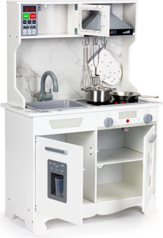 Maak je kinderen blij met deze houten keuken die een echte keuken nabootst en geschikt is voor kinderen vanaf 3 jaar. Het bevat licht- en geluidseffecten, inclusief verlichte branders en een oven met realistische geluiden. Kinderen kunnen spelen en hun fantasie en handvaardigheden ontwikkelen zonder het plezier te missen.