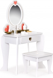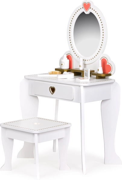 De kaptafel met een grootformaat spiegel en decoratieve lijst met hartmotieven is perfect voor de rol van een kleine prinses of visagiste. De constructie is veilig en biedt voldoende ruimte voor fantasierijk spel.