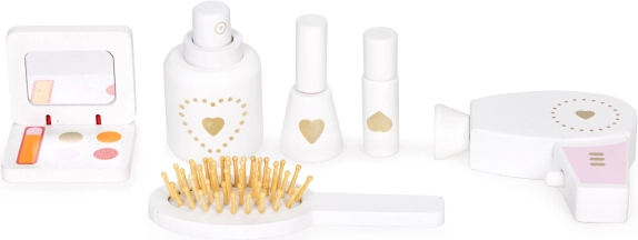 Bij de kaptafel horen speelaccessoires zoals een speelgoedföhn, houten borstel en klein spiegeltje. Alle accessoires hebben gladde randen, wat voor veiligheid voor kinderen zorgt.