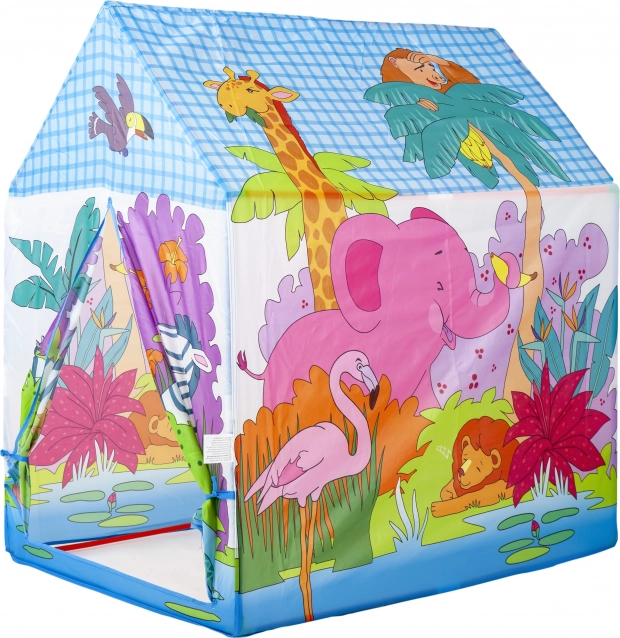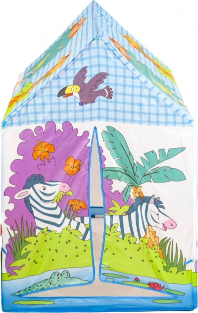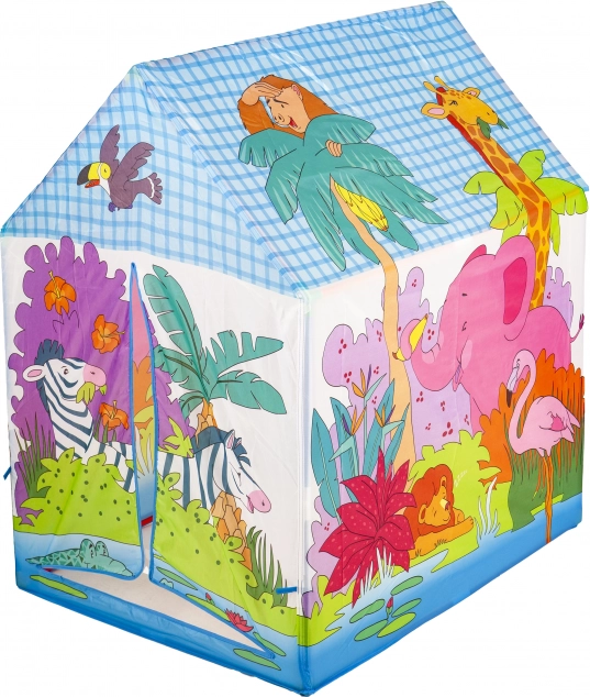 Huisjestent met kleurrijke illustraties van de jungle en dieren (olifant, giraffe, zebra e.a.) zal elke kleine ontdekkingsreiziger blij maken. Dankzij het lichte kunststof frame en de duurzame polyester bekleding is hij ideaal om mee te spelen in de kinderkamer, op het terras of in de tuin.