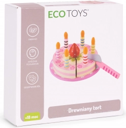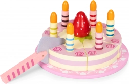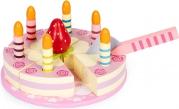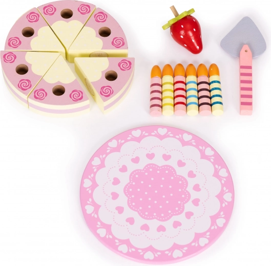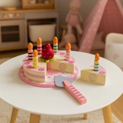 Inhoud van de set: ronde taart verdeeld in punten, 6 gestreepte kaarsjes, houten aardbei, taartschep en sierbord. Alles is van hout en geverfd met kindveilige verf. De set stimuleert rollenspel, traint de oog-handcoördinatie en leert kinderen delen en gasten bedienen.