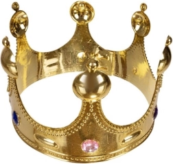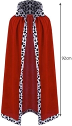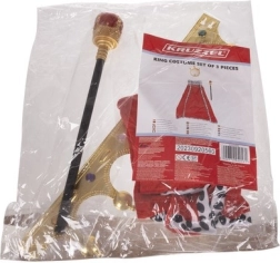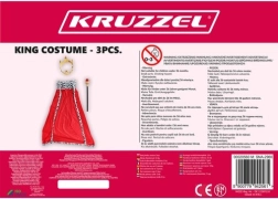 Met deze complete set tover je je kind in een oogwenk om tot een betoverende koning. Mantel van zachte stof in diep rood met zwart-witte bontbies en lange koorden om comfortabel en zeker te dragen. Lichte scepter met rode “edelsteen” geeft het kostuum autoriteit en de flexibele gouden kroon met gekleurde steentjes maakt de koninklijke uitstraling af.