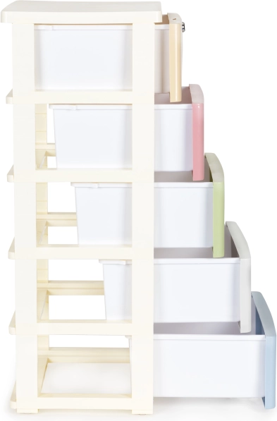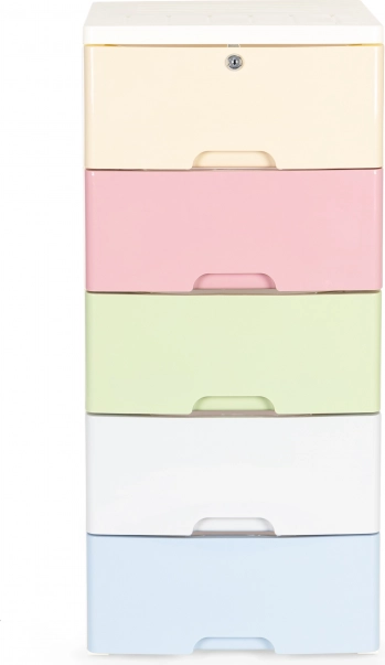 Praktische verrijdbare organizer met 5 uitschuifbare laden, ideaal voor de kinderkamer en badkamer. Biedt een duurzame kunststof constructie, ladevergrendeling tegen eruit vallen en poten met wieltjes voor eenvoudig verplaatsen. De bovenste lade heeft een veiligheidsslot met sleutel en het witte frame met kleurrijke laden geeft het interieur een moderne en verzorgde uitstraling.