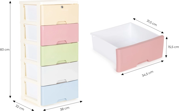 Houd orde stijlvol en moeiteloos. De verrijdbare kast met vijf kleurrijke laden is perfect voor speelgoed, cosmetica en kleine accessoires. Dankzij de stevige kunststof constructie en het stabiele frame is hij geschikt voor zowel de kinderkamer als de badkamer, waar u eenvoudig onderhoud en een strak, modern design zult waarderen.