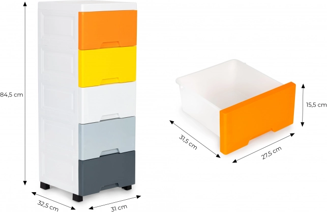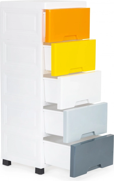 Geniet van overzichtelijke en stijlvolle opslag van speelgoed, cosmetica of kleine spullen. Deze hoge en smalle organizer bespaart ruimte, terwijl vijf ruime lades in verschillende kleuren helpen bij het sorteren en snel terugvinden van items. Het helderwitte frame past in moderne interieurs en is eenvoudig te onderhouden.
