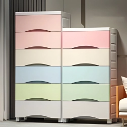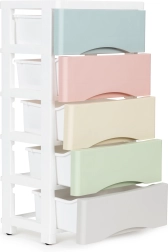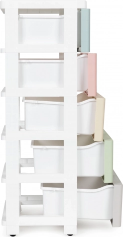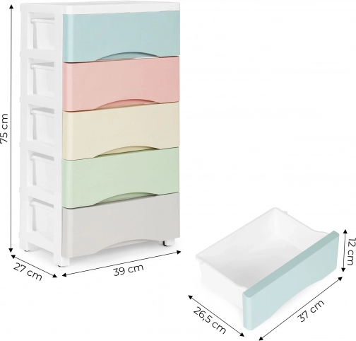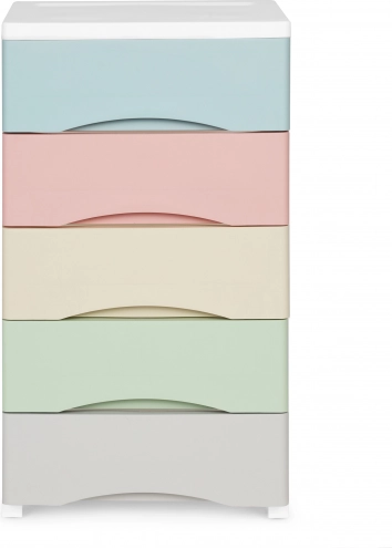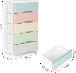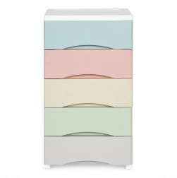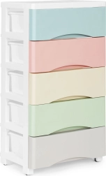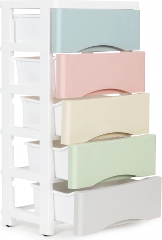 Deze compacte ladekast op wieltjes helpt bij het overzichtelijk opbergen van cosmetica, speelgoed, kantoorspullen en diverse kleinigheden in huis. Vijf ruime lades in pastelkleuren bieden voldoende ruimte en zijn dankzij de geïntegreerde grepen gemakkelijk uit te trekken. Het witte frame oogt fris en past perfect in moderne interieurs.