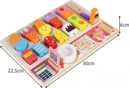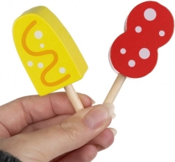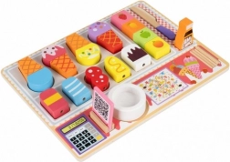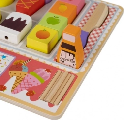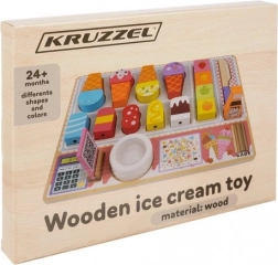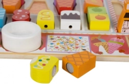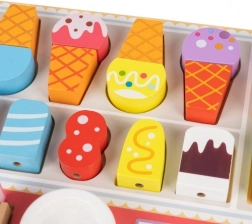 Hoorntjes, bolletjes, ijslolly’s, kommetje, “chocolade”, dienblad en bordje – alles voor eindeloze combinaties en het leren van vormen en kleuren.