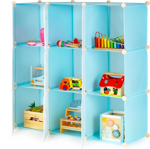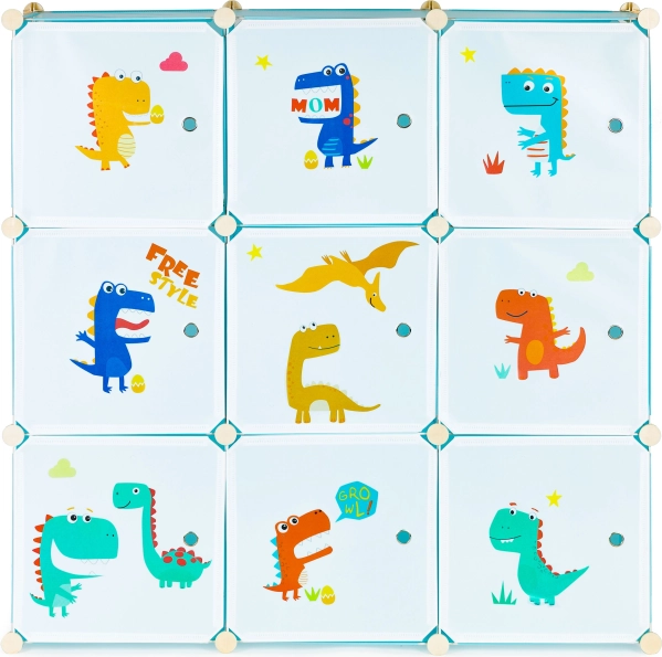 Deze modulaire kast voor de kinderkamer combineert een speels design met dagelijks gebruiksgemak. Negen afsluitbare kubussen met kleurrijke dinosaurusprints zorgen voor overzicht en motiveren kinderen om zelf orde te houden. Dankzij de duurzame polypropyleen panelen en het verstevigde metalen frame is de kast licht maar stabiel.