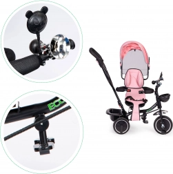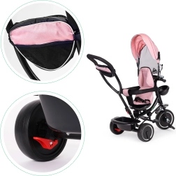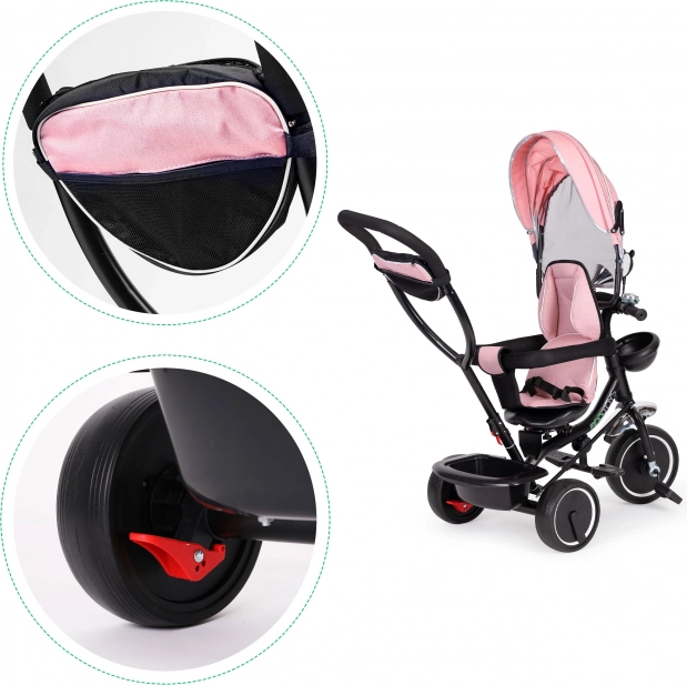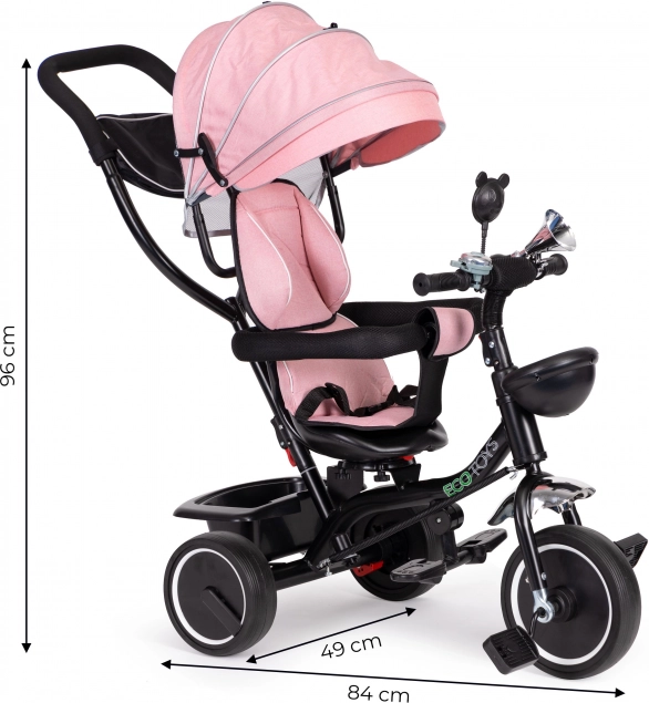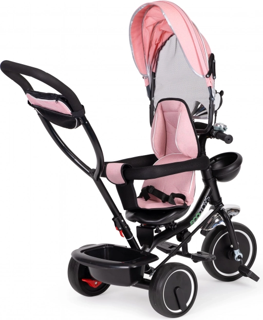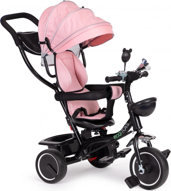 Ontdek de veelzijdige ECOTOYS driewieler die meegroeit met je kind. De draaibare zitting maakt rijden in en tegen de rijrichting mogelijk, zodat jongere kinderen oogcontact met de ouder kunnen houden, terwijl oudere kinderen genieten van het uitzicht naar voren. Een zachte rugleuning, 2-puntsgordel en veiligheidsbeugels zorgen voor stabiliteit en comfort, terwijl de inklapbare kap beschermt tegen zon en lichte regen.