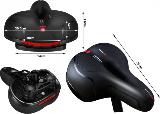 Voor de veiligheid is het zadel voorzien van een reflecterende strip die de zichtbaarheid van de fietser bij weinig licht verbetert.