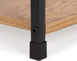 Het poedergecoate metalen frame en de MDF-planken met houtdecor combineren stevigheid met een natuurlijke uitstraling. Beschermende voetjes voorkomen krassen op de vloer.