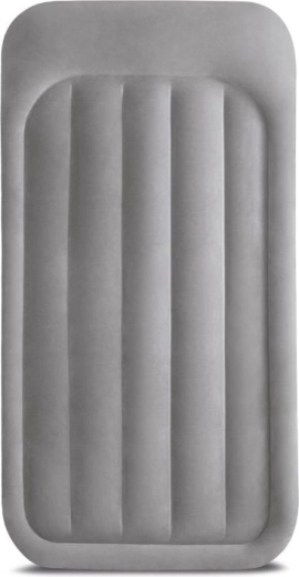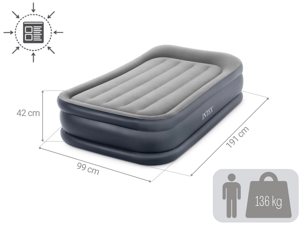 INTEX opblaasbaar eenpersoonsbed biedt afmetingen van 191 × 99 × 42 cm, een ingebouwde elektrische pomp voor snel opblazen, een fluweelzachte velours toplaag voor comfort en een duurzame Fiber‑Tech / Dura‑Beam constructie voor stabiele ondersteuning. Maximale draagkracht 136 kg, inclusief draagtas en reparatiepatch.