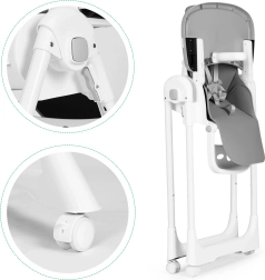 Het stabiele metalen frame, de 5-puntsgordel, de antislip- en wegglijdbeveiliging en de wieltjes met vergrendeling zorgen voor veilig zitten tijdens elke maaltijd en elk spelmoment.