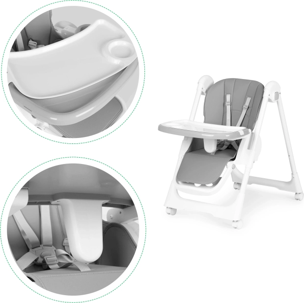 Het metalen frame klapt snel in om ruimte te besparen, wieltjes met rubber loopvlak en rem maken verplaatsen eenvoudig zonder de vloer te krassen. 5-puntsveiligheidsgordels en een anti-wegglijdbeugel onder het dienblad verhogen de veiligheid. De eco-leren bekleding is duurzaam en gemakkelijk af te nemen – ideaal voor dagelijks gebruik.