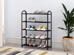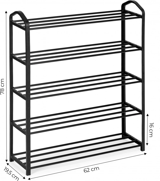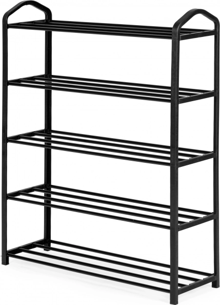 Dit metalen schoenenrek is de perfecte oplossing voor uw gang, kleedkamer of zelfs kantoor. De vijf planken bieden ruimte voor maximaal 15 paar van uw favoriete schoenen en de lichte constructie zorgt voor stabiliteit, zelfs bij volledige belasting.