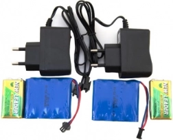 De voeding wordt verzorgd door oplaadbare accupacks (meegeleverd) en voor de afstandsbedieningen zijn 9V-batterijen inbegrepen. Het eerste opladen duurt ongeveer 8 uur, daarna 3–4 uur. Rijtijd van 10–15 minuten per lading is ideaal voor snelle, intensieve actie. Bereik van de afstandsbediening tot 15 meter en de aanbevolen afstand tussen de tanks voor het registreren van treffers is tot 4 meter.