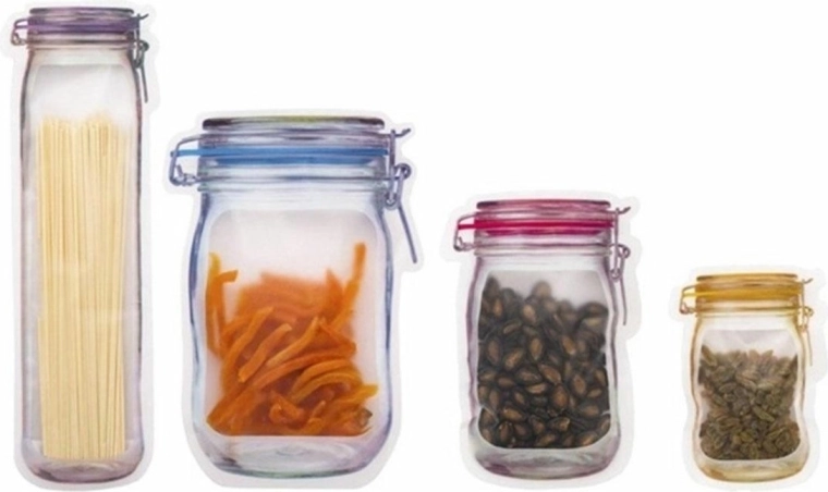 Set van 20 zakjes met trekkoord voor het veilig bewaren van voedsel. Originele vorm met potjesprint. Compleet in 4 verschillende maten voor het verpakken van kleinere en grotere porties.