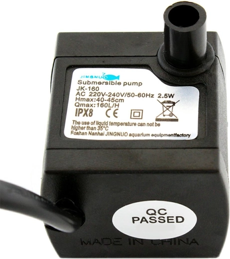 Luchtpomp voor aquaria met een capaciteit tot 160 liter water per uur. Het apparaat vergemakkelijkt het mengen en het oxygenëren van het water, waardoor schadelijke gassen uit het water worden afgevoerd en betere omstandigheden voor de groei van vissen en planten ontstaan. De pomp is zeer stil en verbruikt een verwaarloosbare hoeveelheid elektriciteit (slechts 2,5 W).