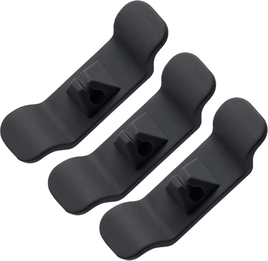 Set van 3 zelfklevende haken die dienen als kabelorganizer. Elke haak maakt het mogelijk om een kabel in een speciale clip in het midden vast te zetten. Ze voorkomen dat kabels in de knoop raken en maken een overzichtelijke ordening mogelijk. Ze zijn zeer stevig – na het plakken hechten ze perfect aan het oppervlak dankzij de sterke lijm.