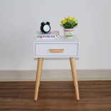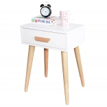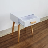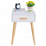 Elegant nachtkastje/bijzettafel in moderne Scandinavische stijl met een wit blad en poten van natuurlijk grenen. Biedt een praktische lade met houten handgreep, een stabiele constructie en compacte afmetingen – ideaal voor zowel de slaapkamer als de woonkamer. Het duurzame gelamineerde blad is gemakkelijk te onderhouden en zorgt voor een lange levensduur.