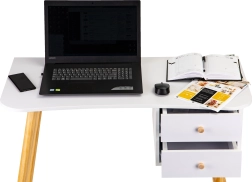 Het witte blad en het natuurlijke hout creëren een moderne uitstraling die past in kantoor, studentenkamer en slaapkamer – rustig, functioneel en tijdloos.