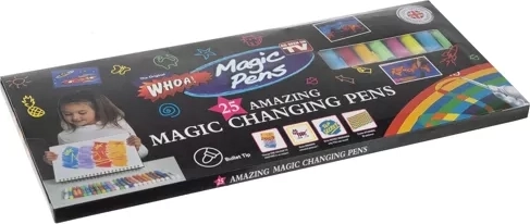 De afbeelding toont de verpakking van '25 Amazing Magic Changing Pens.' De verpakking benadrukt levendige kleuren en het speciale effect van veranderende kleuren, aangevuld met illustraties en foto's die het gebruik van de pennen laten zien.