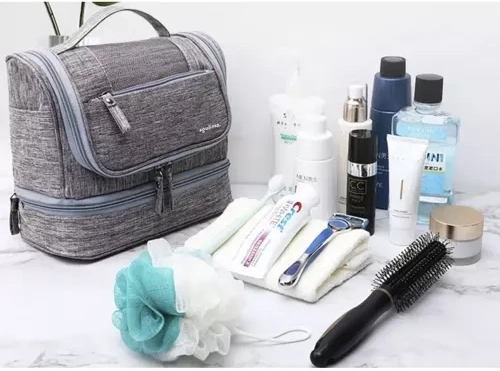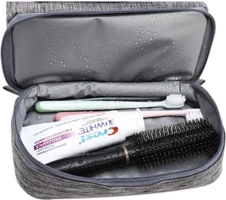 De tas is gemaakt van materialen die water afstoten, ideaal voor gebruik in de badkamer of onderweg.