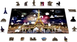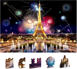 De puzzel is dubbelzijdig (2-in-1): aan de ene kant leg je op basis van de kleurrijke afbeelding van nachtelijk Parijs met vuurwerk, aan de andere kant leg je volgens het herhalende patroon puur op vorm. Gladde randen zonder splinters worden gegarandeerd door preciese laserafwerking en de stevige HDF-plaat van 3–4 mm. In de doos vind je ook een losse voorbeeldposter voor comfortabeler puzzelen.