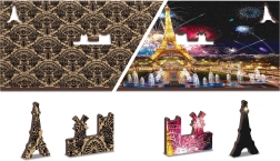 Leg de kleurrijke afbeelding van nachtelijk Parijs of de andere zijde met een herhalend patroon uitsluitend op basis van de vormen van de stukjes. Twee uitdagingen in één doos.