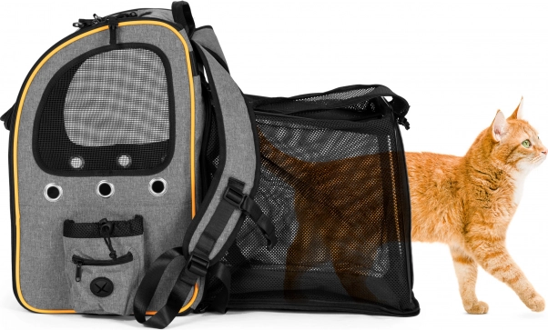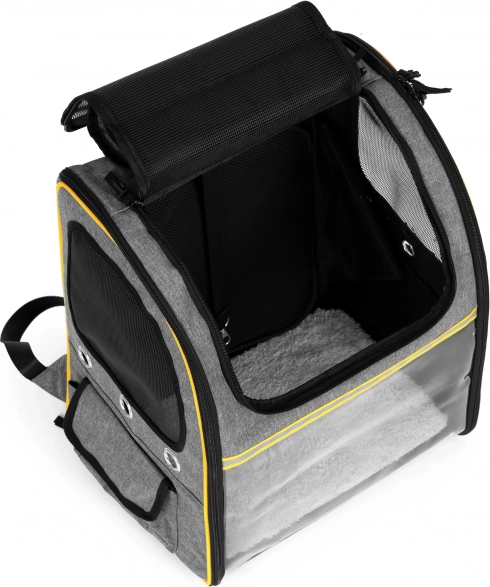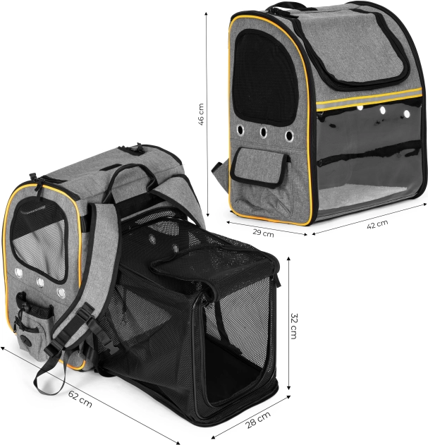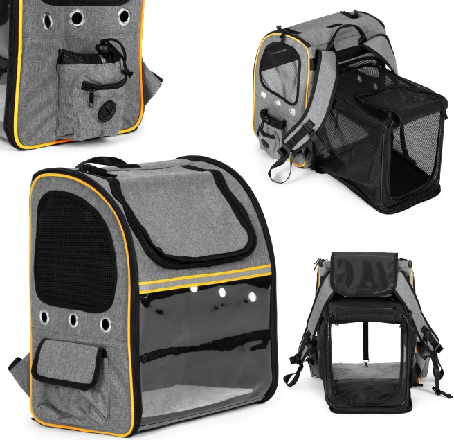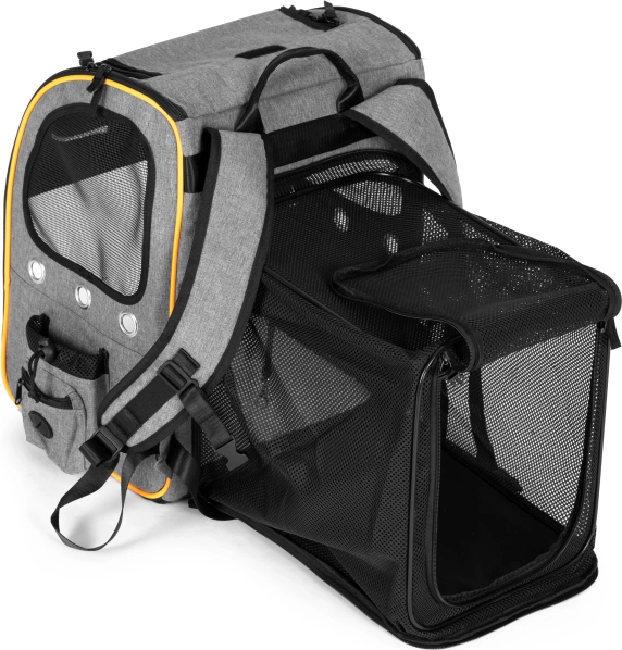 De slimme optie om de achterzijde uit te breiden creëert een rustplek – een klein “ligbedje” waar het dier meer ruimte heeft om te liggen. Toegang wordt geboden door openklapbare instapflappen, inclusief een boveningang met rits en oprolbare gaasbedekking, zodat je je huisdier eenvoudig kunt plaatsen en eruit kunt halen.
