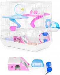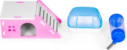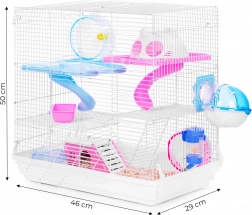 - huisje, 2× glijbaan, looprad, 4 verdiepingen, voerbak, drinkfles