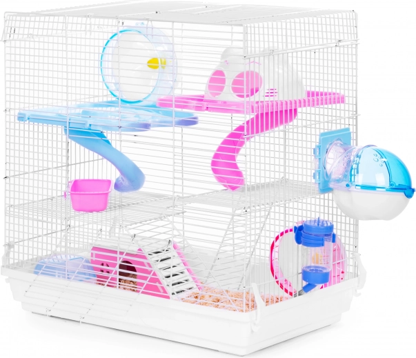 Inclusief huisje, voerbak, drinkfles, twee glijbanen, vier niveaus en een looprad – alles wat je huisdier nodig heeft voor comfort, activiteit en rust.