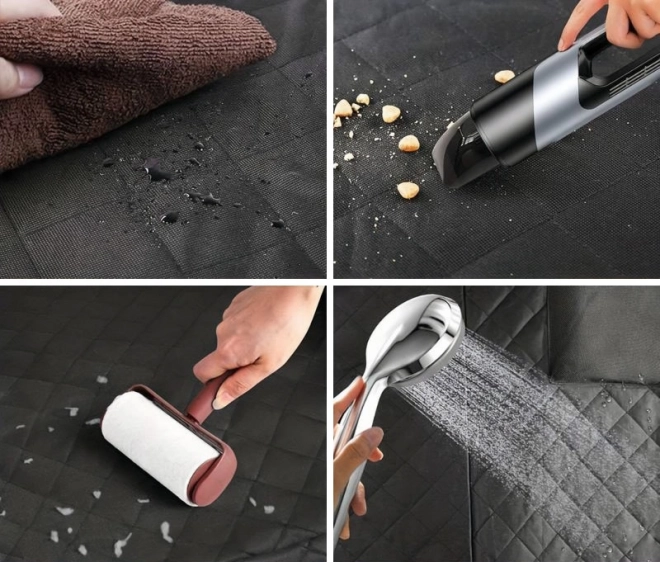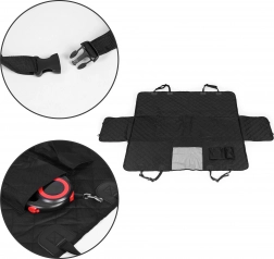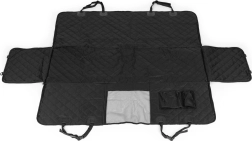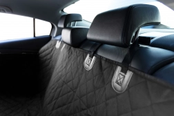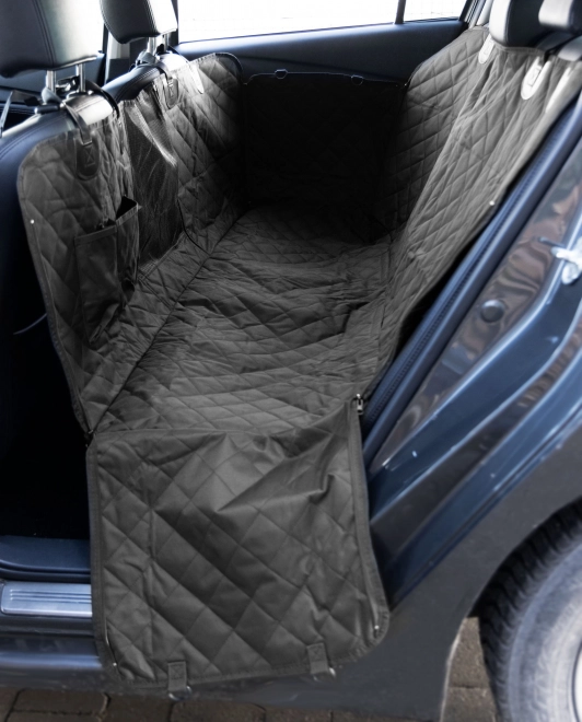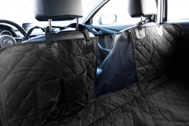 De doorgestikte, slijtvaste hoes bedekt de hele achterbank en beschermt de bekleding tegen haren, modder en krassen. Twee zakken houden riem, snacks en kleine spullen altijd binnen handbereik.