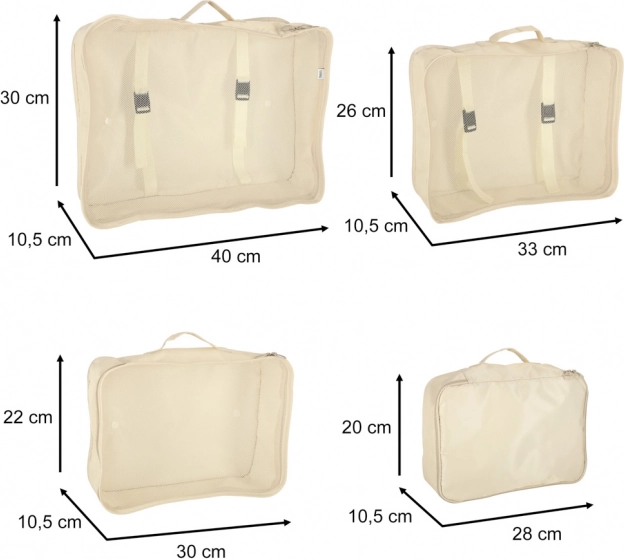 Breng voorgoed orde in je bagage. Deze 8-delige set reisorganizers in elegant beige bevat vier packing cubes voor kleding, een schoenentas, een toilettasje, een trekkoordzak en een klein zakje voor accessoires. Dankzij de lichte en duurzame polyesterstof zijn de organizers gemakkelijk afwasbaar, vuilafstotend en perfect voor overzichtelijk inpakken op reis én voor dagelijks gebruik.