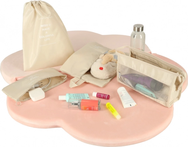 De set omvat een aparte schoenzak met trekkoord en kleinere tasjes voor cosmetica en kleine voorwerpen, zodat alles veilig gescheiden blijft.