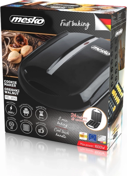 Maak legendarische notenkoekjes in een paar minuten. De MESKO XL bakplaat bakt in één keer 24 helften met een antiaanbaklaag, heeft een snelle opwarming tot 1600 W en dankzij de thermisch geïsoleerde handgrepen en de dekselvergrendeling is hij veilig en comfortabel in gebruik.