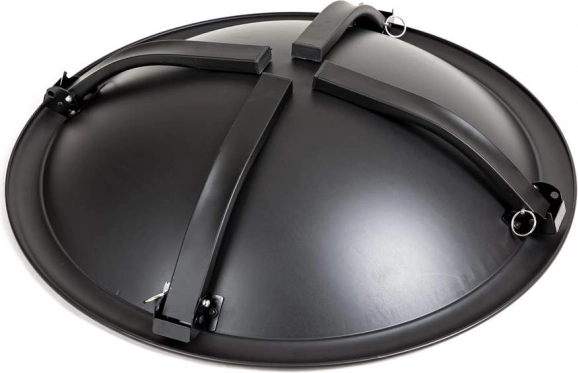 Draagbare metalen tuinvuurplaats van het platte type met een geïntegreerd grillrooster, met een totale diameter van 56 cm en een hoogte van 42 cm, voorzien van een zwarte, hittebestendige afwerking. De vuurplaats is uitgerust met een vonkenscherm dat het ontsnappen van kleine kooldeeltjes voorkomt. Staat op eenvoudig inklapbare poten voor ruimtebesparende opslag.