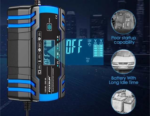 Compacte en intelligente lader voor 12V/24V voertuigaccu’s met digitaal display en reparatiemodus. Biedt snel en veilig opladen, heeft een winter- en zomermodus, automatische beveiliging en pulsherstel om verzwakte accu’s nieuw leven in te blazen. Ideaal voor auto’s, motorfietsen en andere voertuigaccu’s.