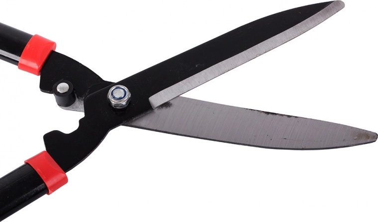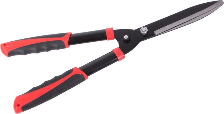 Praktische tuinhegschaar met lange metalen bladen voor het nauwkeurig vormgeven van hagen en sierstruiken. Dankzij het duurzame stalen snijblad en de ergonomische, antislip handgrepen biedt hij comfortabele bediening, een schone snede en betrouwbare prestaties bij het tuinonderhoud.